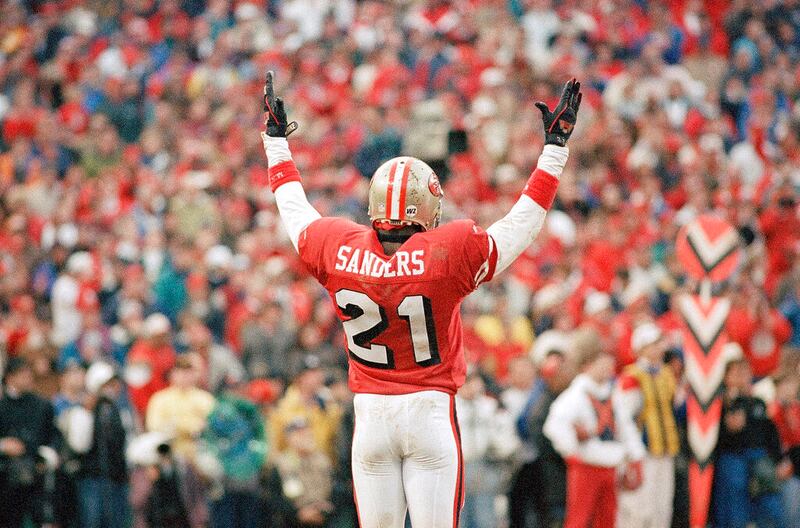 Deion Sanders Deion Sanders acknowledges the crowd, Sunday, Jan. 15, 1995, as his San Francisco 49ers' defeated the Dallas Cowboys, 38-28, to win the NFC Championship. (AP Photo/Paul Sakuma) (Paul Sakuma/AP)