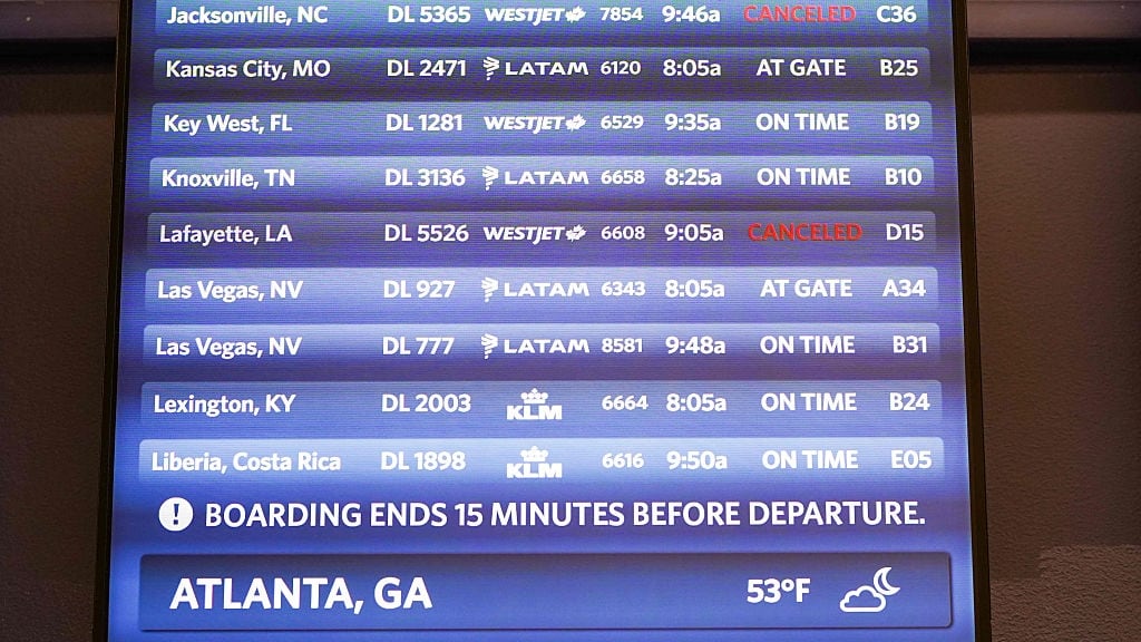 FAA Targets 40 "High-Volume" US Airports For Flight Cuts Amid Government Shutdown ATLANTA, GEORGIA - NOVEMBER 7: A sign shows some cancelations as people travel through Hartsfield-Jackson Atlanta International Airport on November 7, 2025 in Atlanta, Georgia. Today marks day 38 of the government shutdown. (Photo by Megan Varner/Getty Images) (Megan Varner/Getty Images)