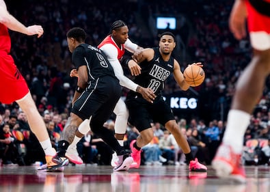Brooklyn Nets v Toronto Raptors TORONTO, CANADA - APRIL 12: Chaney Johnson #31 of the Brooklyn Nets brings the ball up court against the Toronto Raptors during the first half at Scotiabank Arena on April 12, 2026 in Toronto, Ontario, Canada. NOTE TO USER: User expressly acknowledges and agrees that, by downloading and/or using this Photograph, user is consenting to the terms and conditions of the Getty Images License Agreement. (Photo by Mark Blinch/Getty Images) (Mark Blinch/Getty Images)